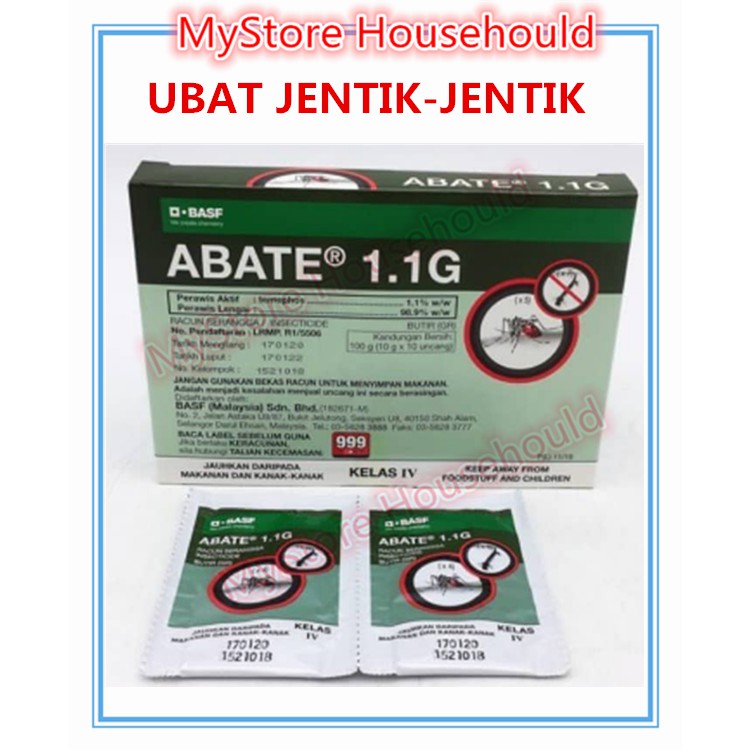 . Pastikan tiada air takung. Ubat Jentik-jentik Abate 11sg. Abate 11G - temephos 11 Digunakan dekat kawasan takungan air untuk membunuh jejentik Menghalang nyamuk daripada membiak.